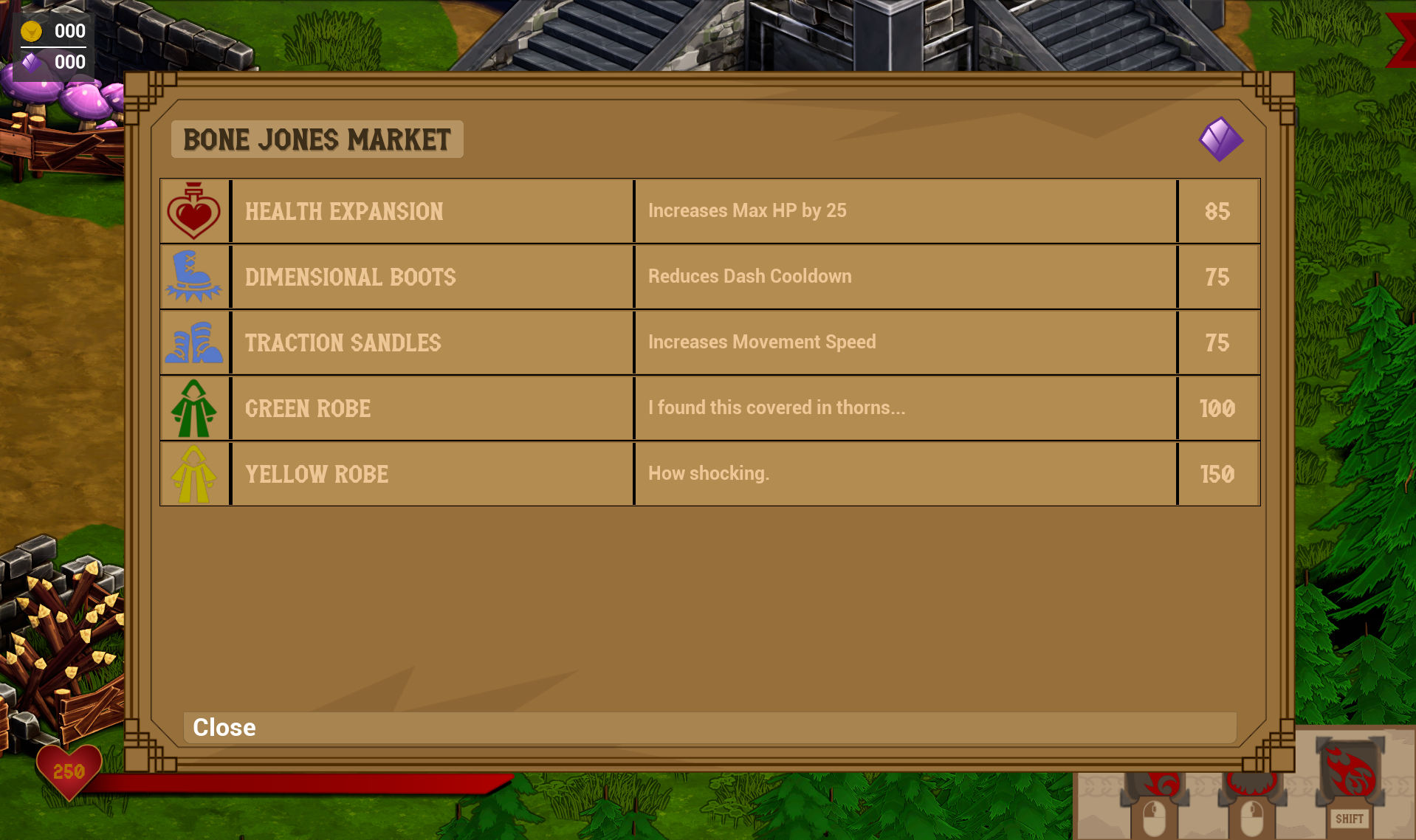 As with any Roguelike, the player has to be able to apply upgrades to their character from run to run. Spells is no different, using two types of currency as part of the Economy System. Players have access to in run currency (Gold), which they can spend at shops that show up after competing a certain amount of rooms. Players also have a second currency type known as Infusion Gems, which they get while in a run from breaking barrels or buying more gems at the shops found throughout the game.