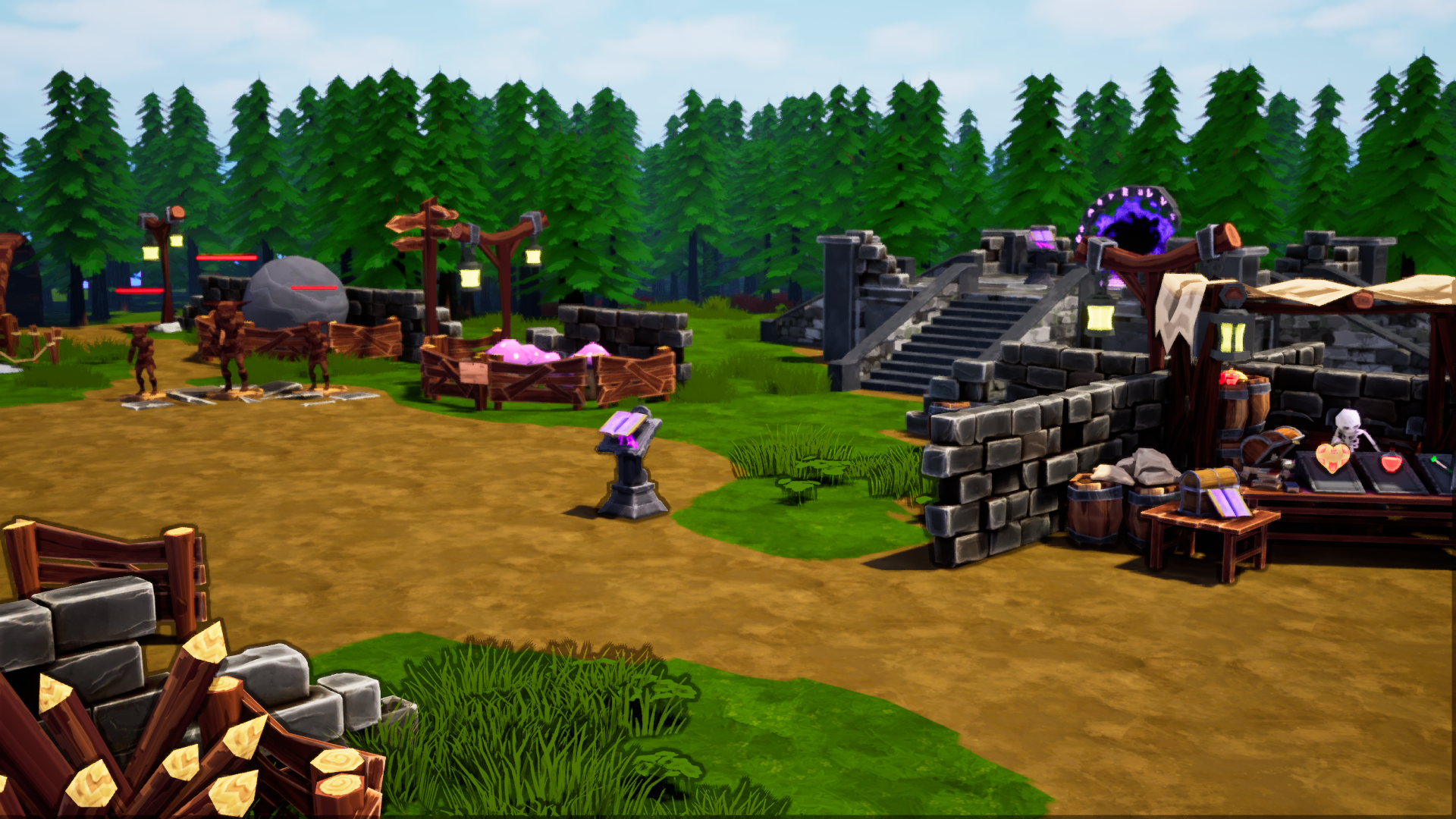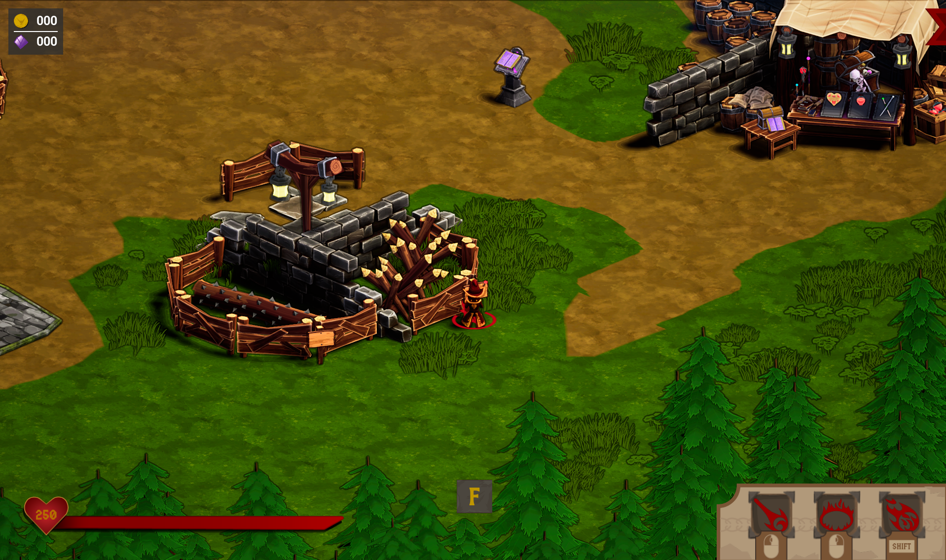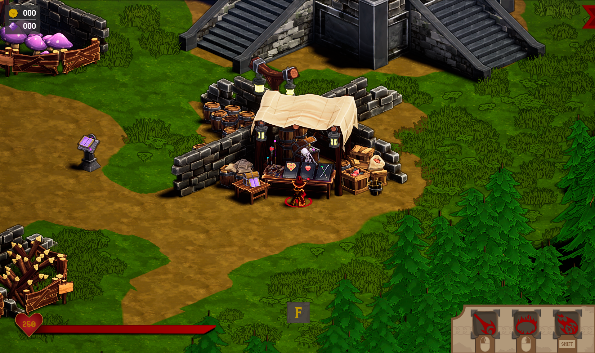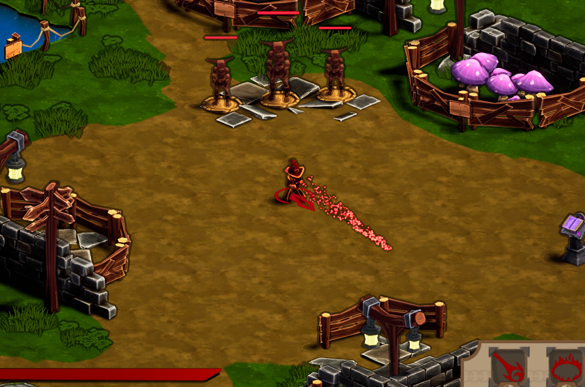 The Spell Stand is also placed in this location to be close to the Shop. Player’s can quickly reach the Shop following the path to the right. Once the player is done, the have the choice of going up, giving another access point to the portal to start a run. The player can also choose to go to their left and enter the Training Yard, putting them right next to the Spell Stand and allowing them to switch classes quickly to get back into the action.