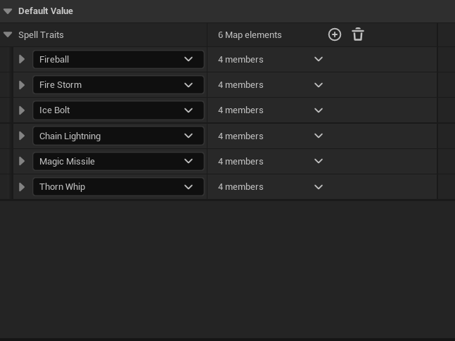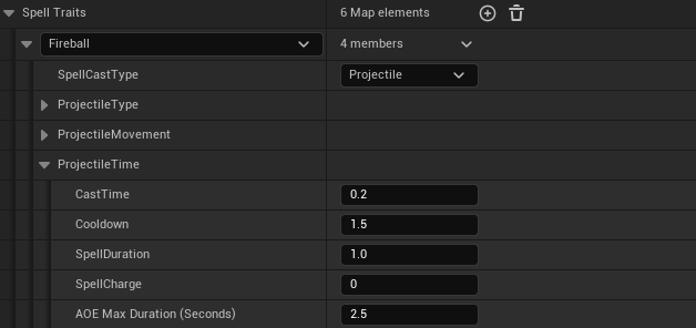When creating a new spell, all of the information is stored in the Spell Traits map. The first element to be filled is the specific spell that will have the associated spell information. For this example we will follow Fireball. There are 4 categories for each element: