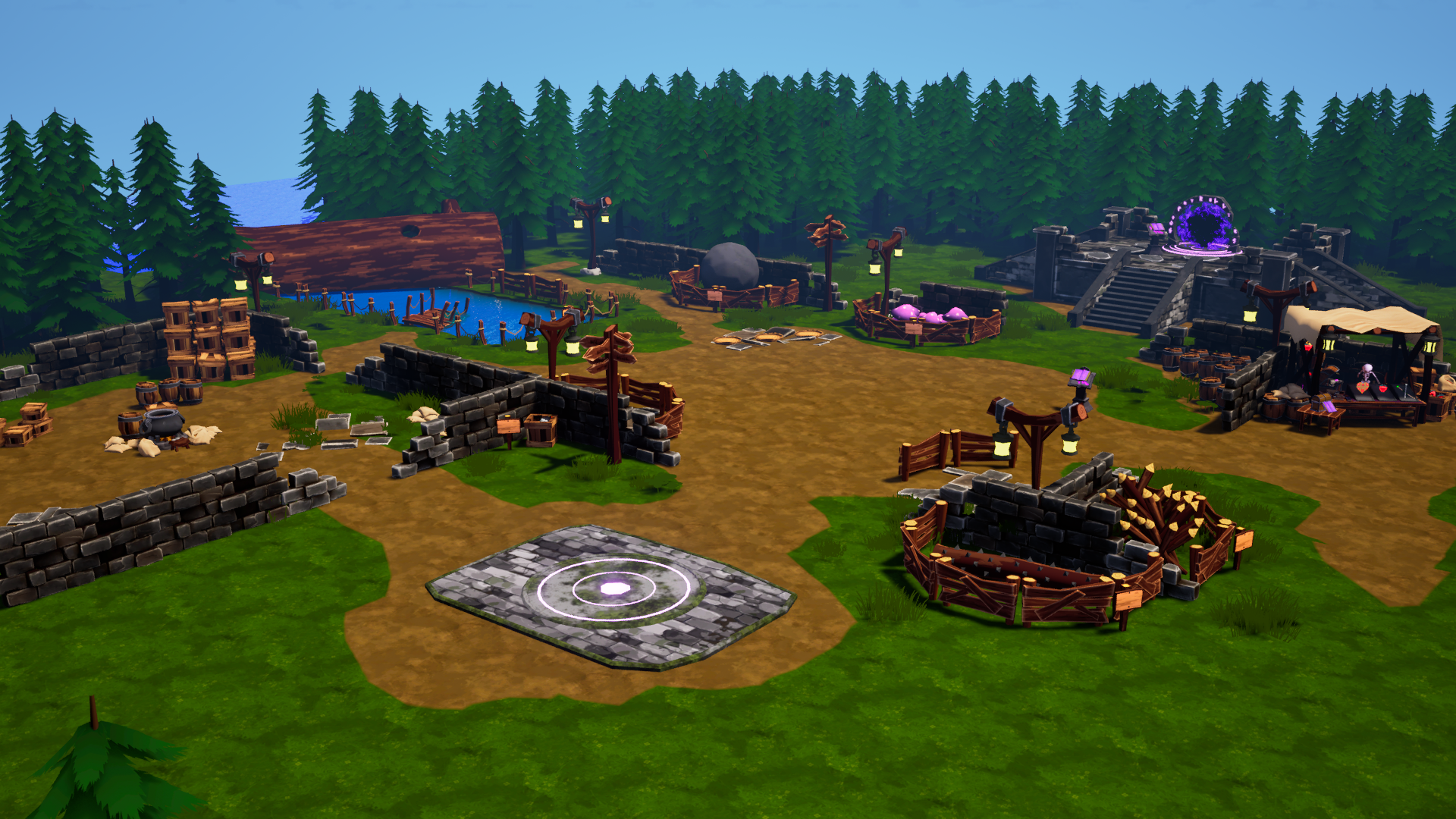 There are many systems to interact with in the Hub World. Some the player will interact with between every run, and some meant to be tertiary. One of the main areas is the Training Yard. Placed in the center of the area, this is meant to be a space that the player will interact with no matter what each run. Its central location forces the player to pass through wherever the player is in the Hub World.