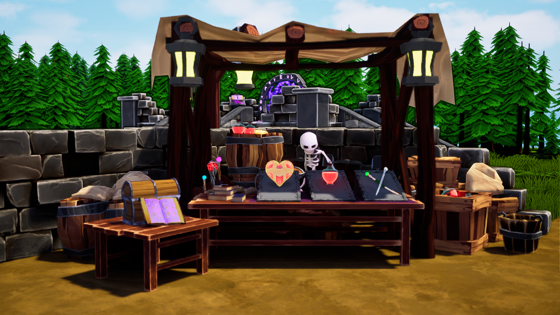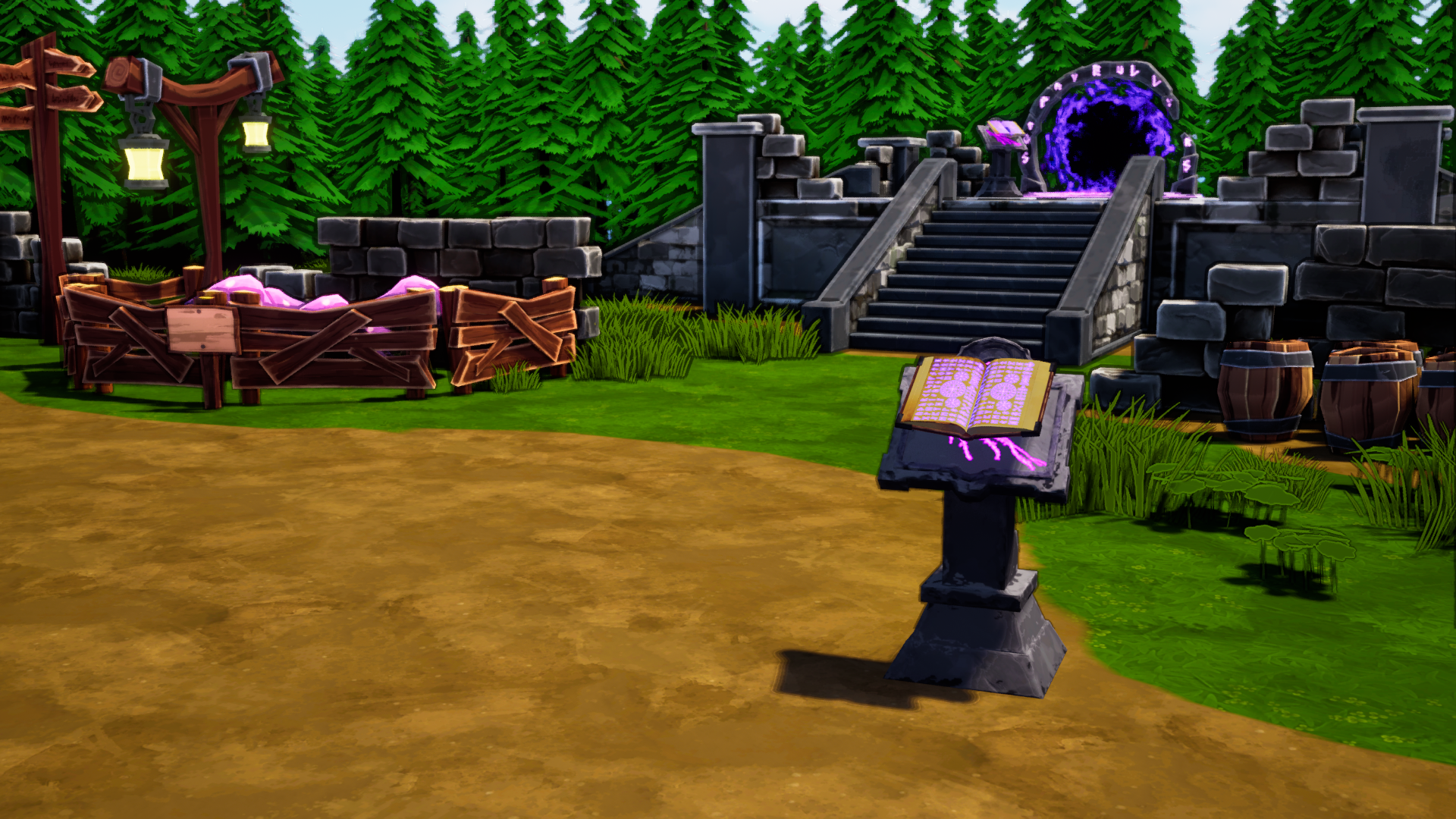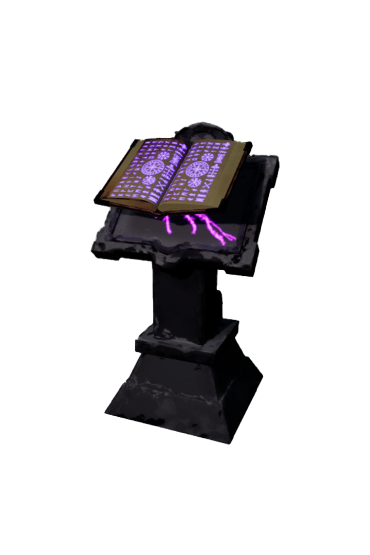 The Training Yard has two main components. The first is the Spell Stand, placed on the far right of the Training Yard, this is in the direct path of the player from spawn to the portal of which the player must enter to start a run. This allows for the player to switch spell classes quickly if the player wants to get back into the action.