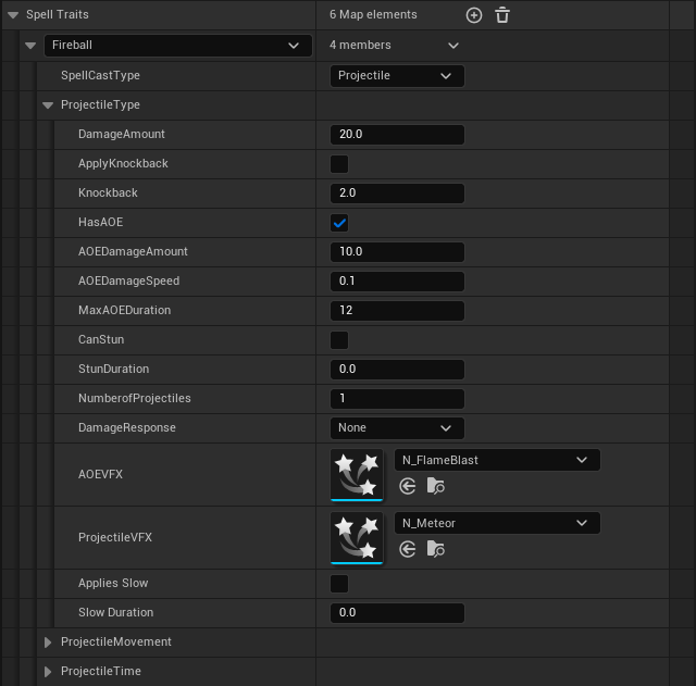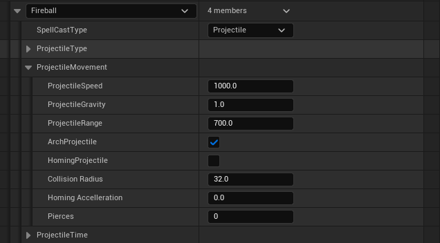 For fireball, we fill the Spell Cast Type in as a projectile, as this spell will fire a projectile from the player character. Next we move into the Projectile Type structure. This structure holds all the base information required for a spell. How much damage will be applied, should an AOE spawn on impact, what VFX is associated with the spell. Any information that relates to how the spell will react is stored here.